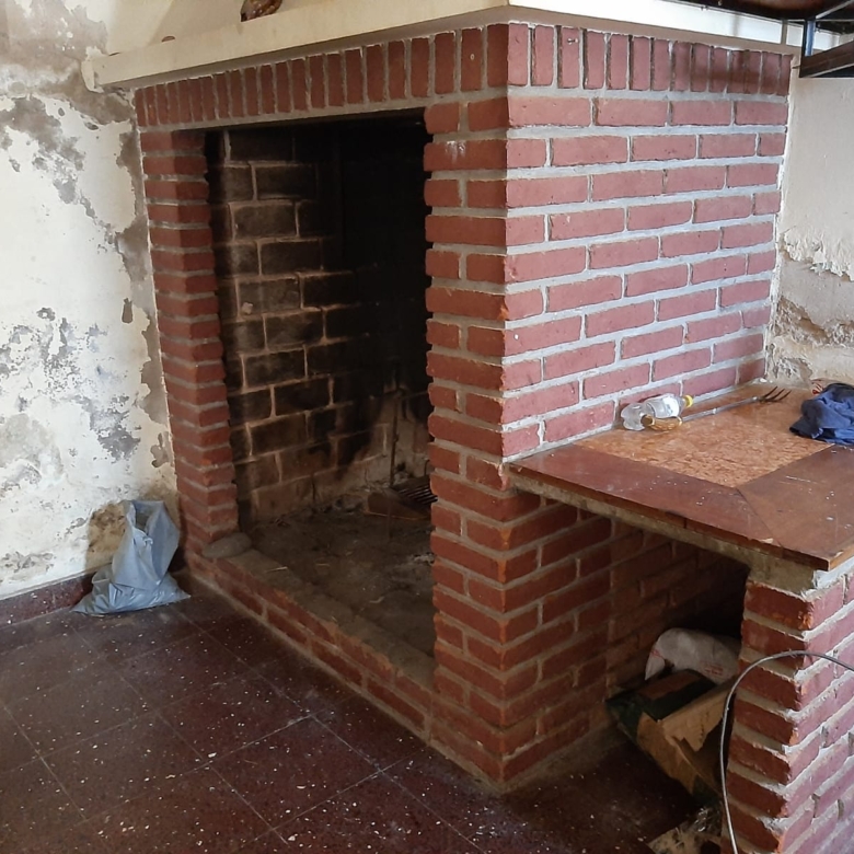 Patio delantero entrada para auto, garaje con fogón y losa